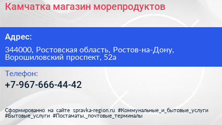 Камчатка, магазин морепродуктов по адресу 344000, Ростовская область, Ростов-на-Дону, Ворошиловский проспект, 52а в дальнейшем Организация, размещена в следующих категориях:
