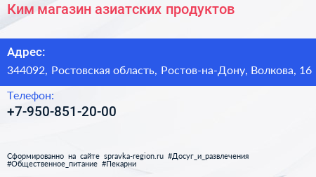 Ким, магазин азиатских продуктов по адресу 344092, Ростовская область, Ростов-на-Дону, Волкова, 16 в дальнейшем Организация, размещена в следующих категориях: