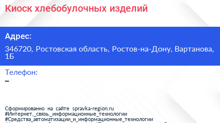 Киоск хлебобулочных изделий по адресу 346720, Ростовская область, Ростов-на-Дону, Вартанова, 1Б в дальнейшем Организация, размещена в следующих категориях: