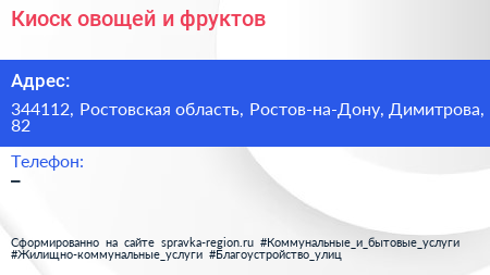 Киоск овощей и фруктов по адресу 344112, Ростовская область, Ростов-на-Дону, Димитрова, 82 в дальнейшем Организация, размещена в следующих категориях: