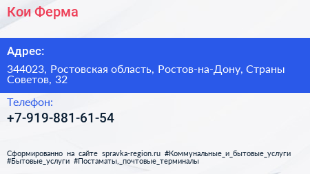 Кои Ферма по адресу 344023, Ростовская область, Ростов-на-Дону, Страны Советов, 32 в дальнейшем Организация, размещена в следующих категориях: