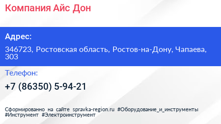 Компания Айс-Дон по адресу 346723, Ростовская область, Ростов-на-Дону, Чапаева, 303 в дальнейшем Организация, размещена в следующих категориях: