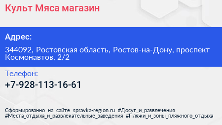 Культ Мяса, магазин по адресу 344092, Ростовская область, Ростов-на-Дону, проспект Космонавтов, 2/2 в дальнейшем Организация, размещена в следующих категориях:
