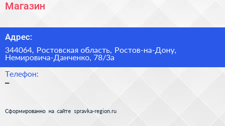Магазин по адресу 344064, Ростовская область, Ростов-на-Дону, Немировича-Данченко, 78/3а в дальнейшем Организация, размещена в следующих категориях: