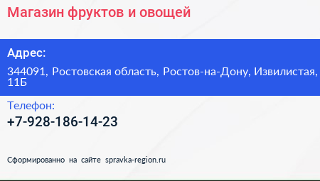 Магазин фруктов и овощей по адресу 344091, Ростовская область, Ростов-на-Дону, Извилистая, 11Б в дальнейшем Организация, размещена в следующих категориях: