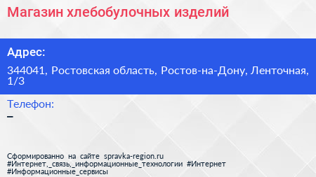 Магазин хлебобулочных изделий по адресу 344041, Ростовская область, Ростов-на-Дону, Ленточная, 1/3 в дальнейшем Организация, размещена в следующих категориях: