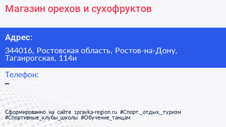 Магазин орехов и сухофруктов по адресу 344016, Ростовская область, Ростов-на-Дону, Таганрогская, 114и в дальнейшем Организация, размещена в следующих категориях: