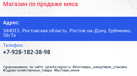 Магазин по продаже мяса по адресу 344015, Ростовская область, Ростов-на-Дону, Ерёменко, 58/7а в дальнейшем Организация, размещена в следующих категориях: