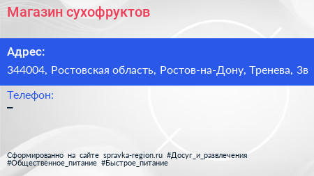 Магазин сухофруктов по адресу 344004, Ростовская область, Ростов-на-Дону, Тренева, 3в в дальнейшем Организация, размещена в следующих категориях: