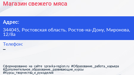 Магазин свежего мяса по адресу 344045, Ростовская область, Ростов-на-Дону, Миронова, 12/8а в дальнейшем Организация, размещена в следующих категориях: