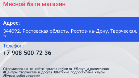 Мясной батя, магазин по адресу 344092, Ростовская область, Ростов-на-Дону, Творческая, 5 в дальнейшем Организация, размещена в следующих категориях: