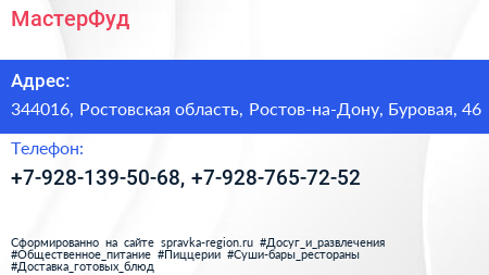 МастерФуд по адресу 344016, Ростовская область, Ростов-на-Дону, Буровая, 46 в дальнейшем Организация, размещена в следующих категориях: