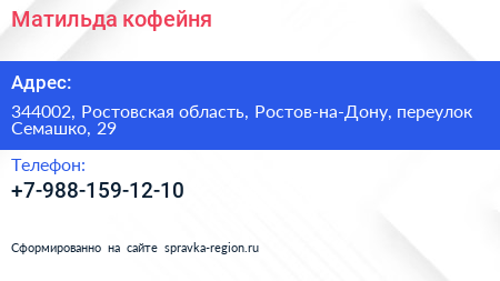 Матильда, кофейня по адресу 344002, Ростовская область, Ростов-на-Дону, переулок Семашко, 29 в дальнейшем Организация, размещена в следующих категориях: