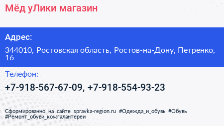 Мёд уЛики, магазин по адресу 344010, Ростовская область, Ростов-на-Дону, Петренко, 16 в дальнейшем Организация, размещена в следующих категориях:
