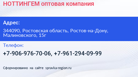 НОТТИНГЕМ, оптовая компания по адресу 344090, Ростовская область, Ростов-на-Дону, Малиновского, 15г в дальнейшем Организация, размещена в следующих категориях: