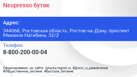 Nespresso, бутик по адресу 344068, Ростовская область, Ростов-на-Дону, проспект Михаила Нагибина, 32/2 в дальнейшем Организация, размещена в следующих категориях: