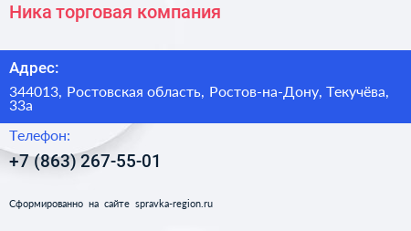 Ника, торговая компания по адресу 344013, Ростовская область, Ростов-на-Дону, Текучёва, 33а в дальнейшем Организация, размещена в следующих категориях: