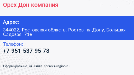 Орех Дон, компания по адресу 344022, Ростовская область, Ростов-на-Дону, Большая Садовая, 71е в дальнейшем Организация, размещена в следующих категориях: