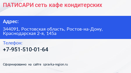 ПАТИСАРИ, сеть кафе-кондитерских по адресу 344091, Ростовская область, Ростов-на-Дону, Краснодарская 2-я, 145а в дальнейшем Организация, размещена в следующих категориях:
