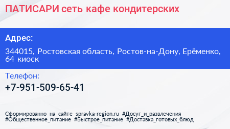 ПАТИСАРИ, сеть кафе-кондитерских по адресу 344015, Ростовская область, Ростов-на-Дону, Ерёменко, 64 киоск в дальнейшем Организация, размещена в следующих категориях: