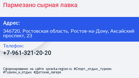 Пармезано, сырная лавка по адресу 346720, Ростовская область, Ростов-на-Дону, Аксайский проспект, 23 в дальнейшем Организация, размещена в следующих категориях: