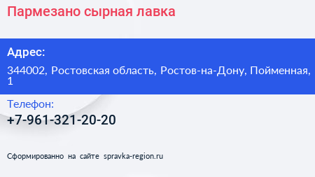 Пармезано, сырная лавка по адресу 344002, Ростовская область, Ростов-на-Дону, Пойменная, 1 в дальнейшем Организация, размещена в следующих категориях: