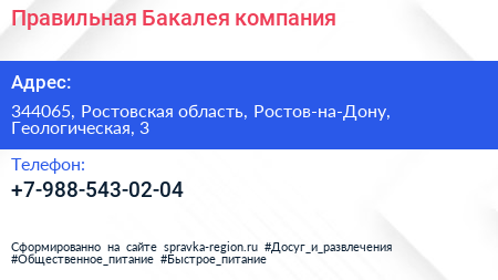 Правильная Бакалея, компания по адресу 344065, Ростовская область, Ростов-на-Дону, Геологическая, 3 в дальнейшем Организация, размещена в следующих категориях: