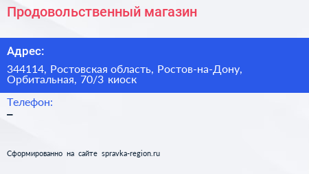 Продовольственный магазин по адресу 344114, Ростовская область, Ростов-на-Дону, Орбитальная, 70/3 киоск в дальнейшем Организация, размещена в следующих категориях:
