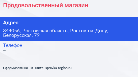 Продовольственный магазин по адресу 344056, Ростовская область, Ростов-на-Дону, Белорусская, 79 в дальнейшем Организация, размещена в следующих категориях: