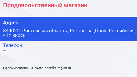 Продовольственный магазин по адресу 344020, Ростовская область, Ростов-на-Дону, Российская, 44г киоск в дальнейшем Организация, размещена в следующих категориях: