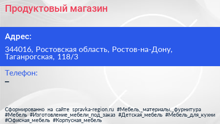 Продуктовый магазин по адресу 344016, Ростовская область, Ростов-на-Дону, Таганрогская, 118/3 в дальнейшем Организация, размещена в следующих категориях: