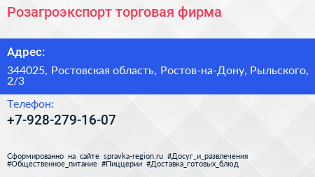 Розагроэкспорт, торговая фирма по адресу 344025, Ростовская область, Ростов-на-Дону, Рыльского, 2/3 в дальнейшем Организация, размещена в следующих категориях: