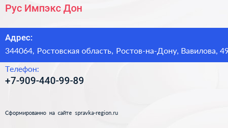 Рус Импэкс Дон по адресу 344064, Ростовская область, Ростов-на-Дону, Вавилова, 49 в дальнейшем Организация, размещена в следующих категориях: