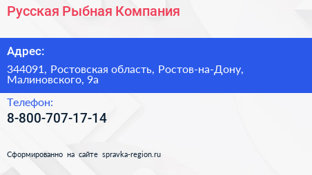 Русская Рыбная Компания по адресу 344091, Ростовская область, Ростов-на-Дону, Малиновского, 9а в дальнейшем Организация, размещена в следующих категориях: