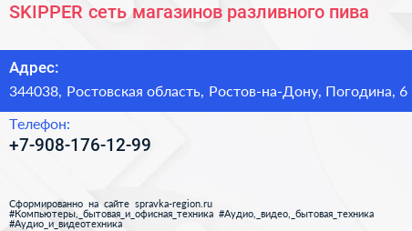 SKIPPER, сеть магазинов разливного пива по адресу 344038, Ростовская область, Ростов-на-Дону, Погодина, 6 в дальнейшем Организация, размещена в следующих категориях: