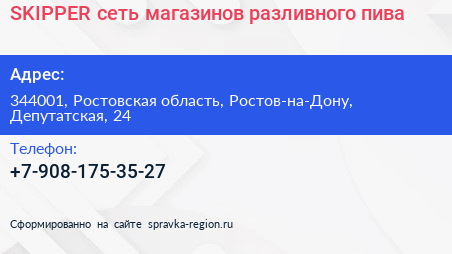 SKIPPER, сеть магазинов разливного пива по адресу 344001, Ростовская область, Ростов-на-Дону, Депутатская, 24 в дальнейшем Организация, размещена в следующих категориях: