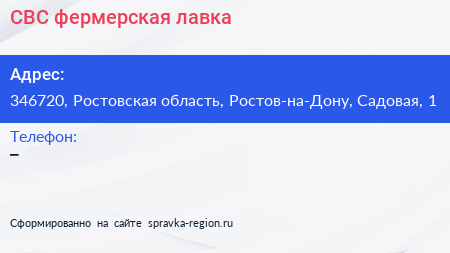 СВС, фермерская лавка по адресу 346720, Ростовская область, Ростов-на-Дону, Садовая, 1 в дальнейшем Организация, размещена в следующих категориях: