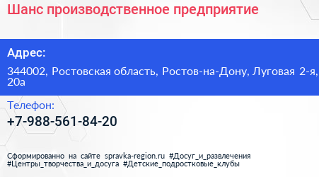 Шанс, производственное предприятие по адресу 344002, Ростовская область, Ростов-на-Дону, Луговая 2-я, 20а в дальнейшем Организация, размещена в следующих категориях: