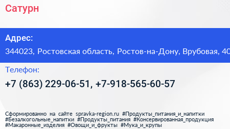 Сатурн по адресу 344023, Ростовская область, Ростов-на-Дону, Врубовая, 40 в дальнейшем Организация, размещена в следующих категориях: