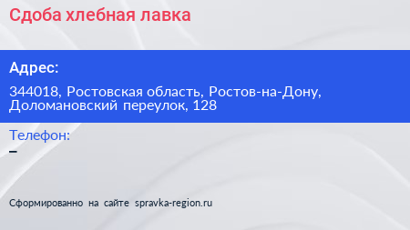 Сдоба, хлебная лавка по адресу 344018, Ростовская область, Ростов-на-Дону, Доломановский переулок, 128 в дальнейшем Организация, размещена в следующих категориях: