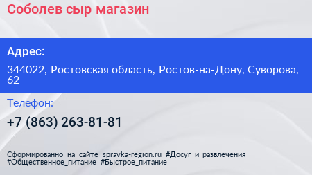 Соболев сыр, магазин по адресу 344022, Ростовская область, Ростов-на-Дону, Суворова, 62 в дальнейшем Организация, размещена в следующих категориях: