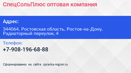 СпецСольПлюс, оптовая компания по адресу 344064, Ростовская область, Ростов-на-Дону, Радиаторный переулок, 4 в дальнейшем Организация, размещена в следующих категориях:
