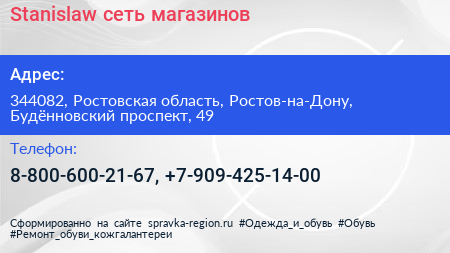 Stanislaw, сеть магазинов по адресу 344082, Ростовская область, Ростов-на-Дону, Будённовский проспект, 49 в дальнейшем Организация, размещена в следующих категориях: