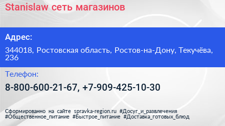 Stanislaw, сеть магазинов по адресу 344018, Ростовская область, Ростов-на-Дону, Текучёва, 236 в дальнейшем Организация, размещена в следующих категориях: