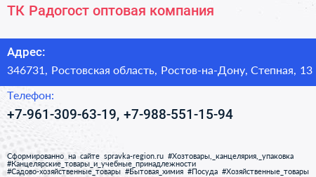 ТК Радогост, оптовая компания по адресу 346731, Ростовская область, Ростов-на-Дону, Степная, 13 в дальнейшем Организация, размещена в следующих категориях: