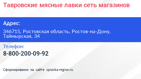 Тавровские мясные лавки, сеть магазинов по адресу 346715, Ростовская область, Ростов-на-Дону, Таймырская, 34 в дальнейшем Организация, размещена в следующих категориях: