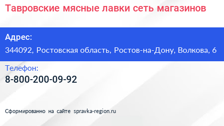Тавровские мясные лавки, сеть магазинов по адресу 344092, Ростовская область, Ростов-на-Дону, Волкова, 6 в дальнейшем Организация, размещена в следующих категориях: