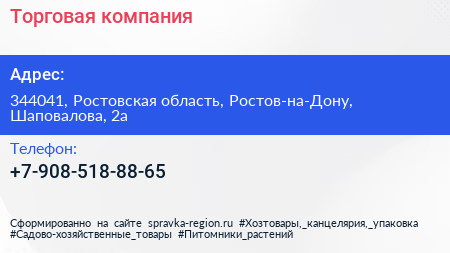 Торговая компания по адресу 344041, Ростовская область, Ростов-на-Дону, Шаповалова, 2а в дальнейшем Организация, размещена в следующих категориях: