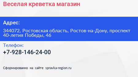 Веселая креветка, магазин по адресу 344072, Ростовская область, Ростов-на-Дону, проспект 40-летия Победы, 46 в дальнейшем Организация, размещена в следующих категориях:
