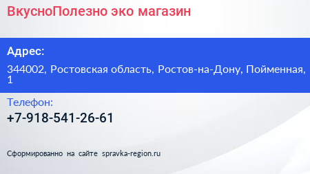 ВкусноПолезно, эко-магазин по адресу 344002, Ростовская область, Ростов-на-Дону, Пойменная, 1 в дальнейшем Организация, размещена в следующих категориях: